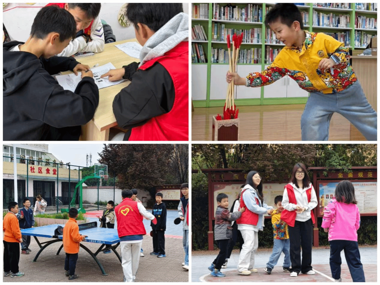 活动现场暖意融融,志愿者们分工明确、温情投入。学业辅导环节,志愿者们耐心倾听儿童的学习困惑,细致讲解知识点、梳理学习思路,助力孩子们查漏补缺、巩固所学。团体辅导环节,投壶、老鹰捉小鸡、乒乓球等趣味环节依次开展,志愿者与孩子们默契互动、同玩同乐,投壶时的凝神专注、游戏中的欢声笑语,让社区活动场地充满了童真与活力,也拉近了志愿者与孩子们的距离。