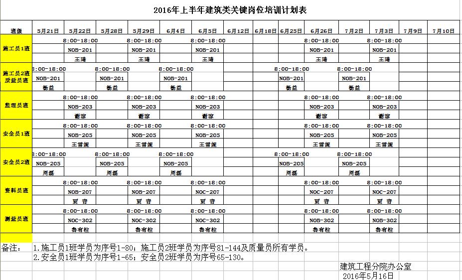 2016年上半年建筑类关键岗位培训计划表